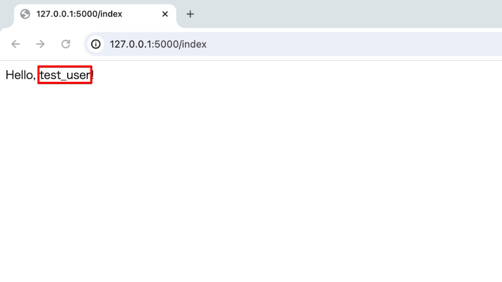 また、認証が成功した状態で index ディレクトリに(http://127.0.0.1:5000/index) にアクセスすると、「Hello, (ユーザー名)!」 と表示されます。