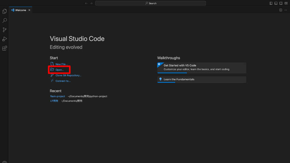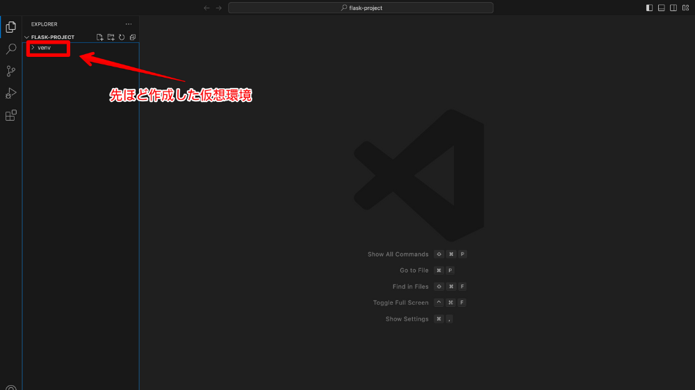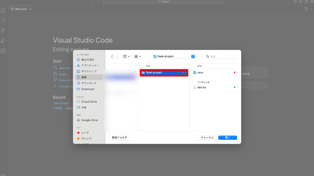 先程作成した Flask プロジェクトを選択肢、VSCode 上で開きます。