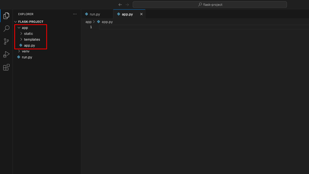 flask-project ├app/ │ ├templates/ │ ├static/ │ └app.py ├venv └run.py