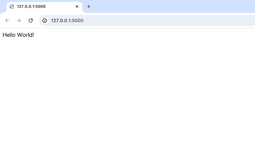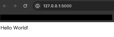 Webブラウザでサーバーの URL(http://127.0.0.1:5000)にアクセスすると、Hello World!と表示されます。