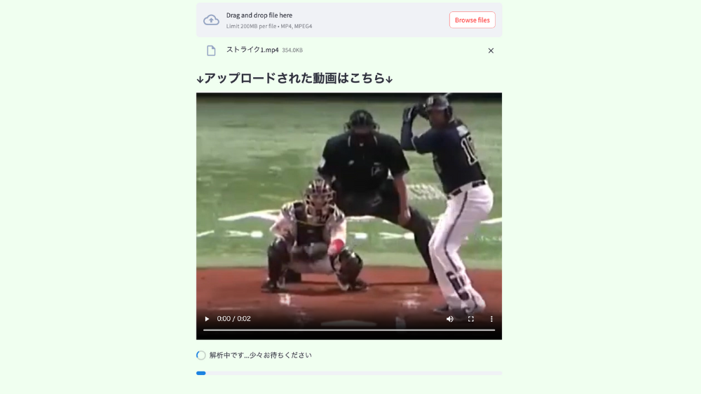 動画アップロードの部分をクリックしてフォルダから動画を選択すると、解析が自動で行われます。