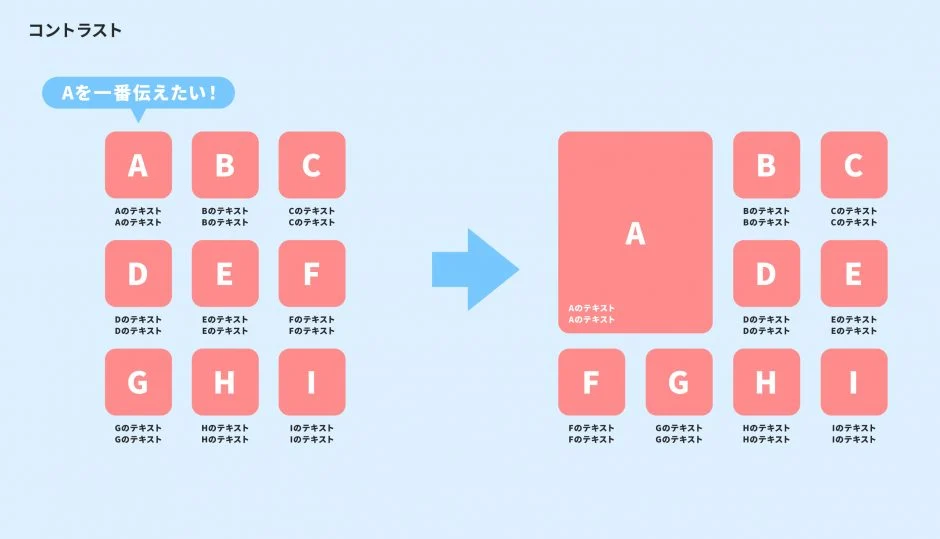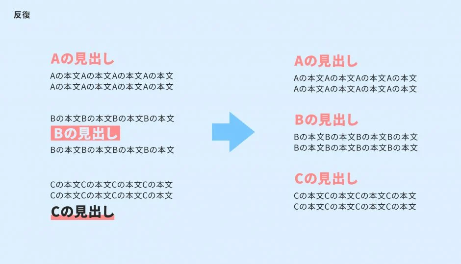 具体的には、レイアウトや色、モチーフなどの要素を何度も使って一貫性を持たせます。