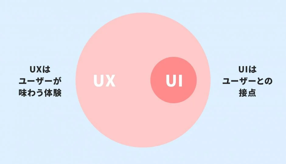 「UI/UX」と並べて表記されることが多いので混同しがちですが、並列するものではなく、UXという大きな領域があり、その中の一部にUIがあります。