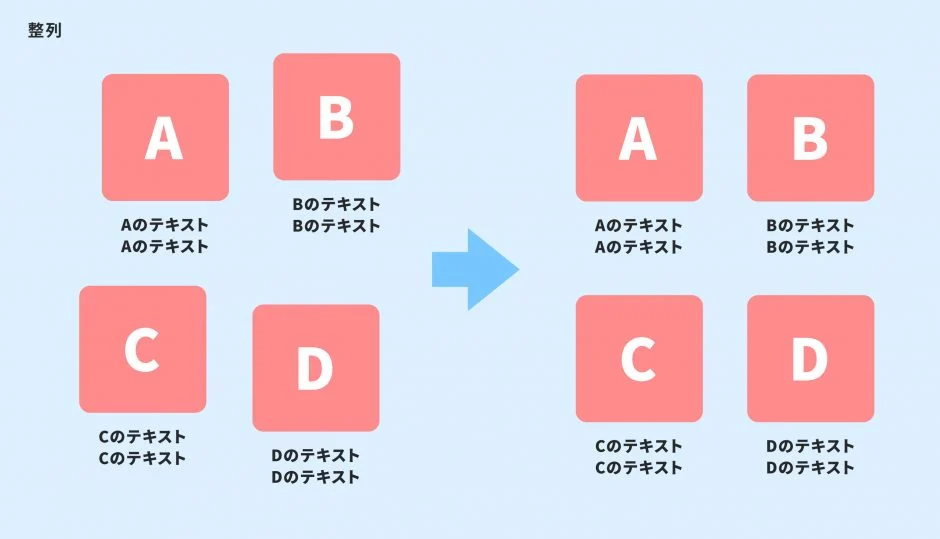 具体的には、横書きの文章を左揃えにする、図やイラストの余白をそろえる、などが考えられます。