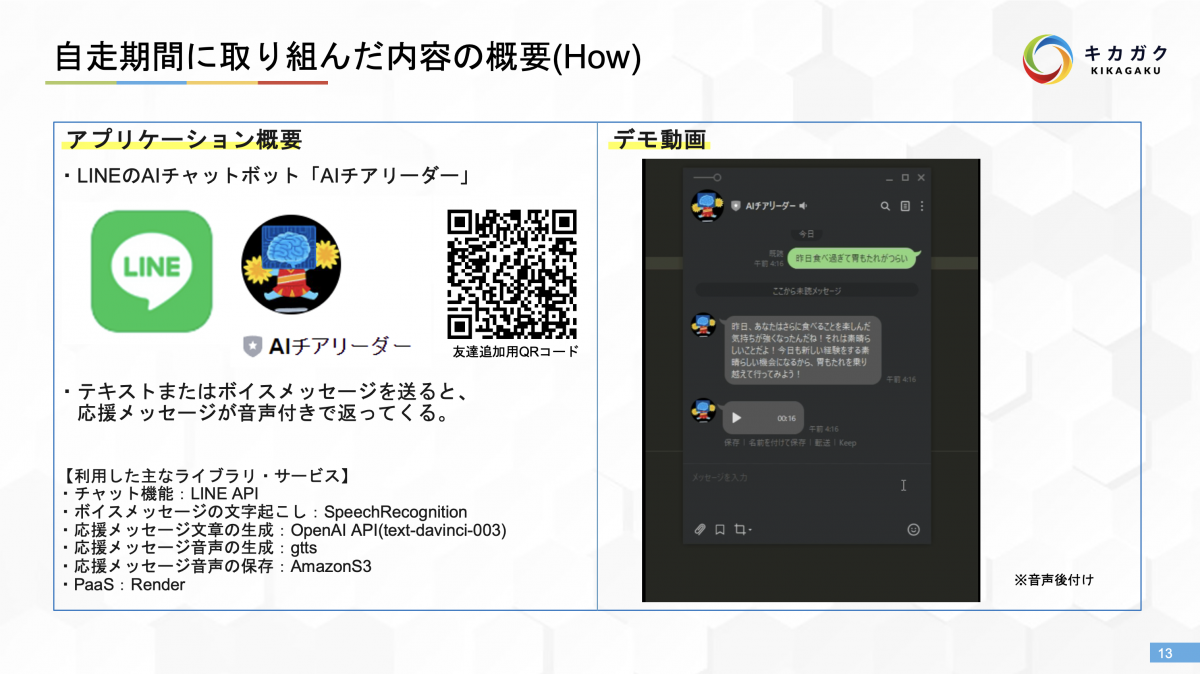 チャットボットを LINE で作成するだけでなく、音声付きで返ってくるというアプリをカリキュラムで学んだ内容だけでなく、クラウド等必要な知識をプラスアルファで学ばれておりました。