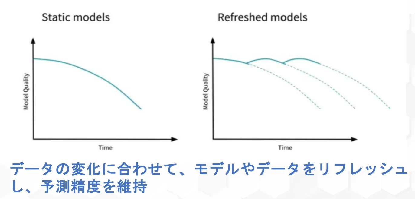 データにも鮮度があり、データの再取得やモデルの再学習が必要となる