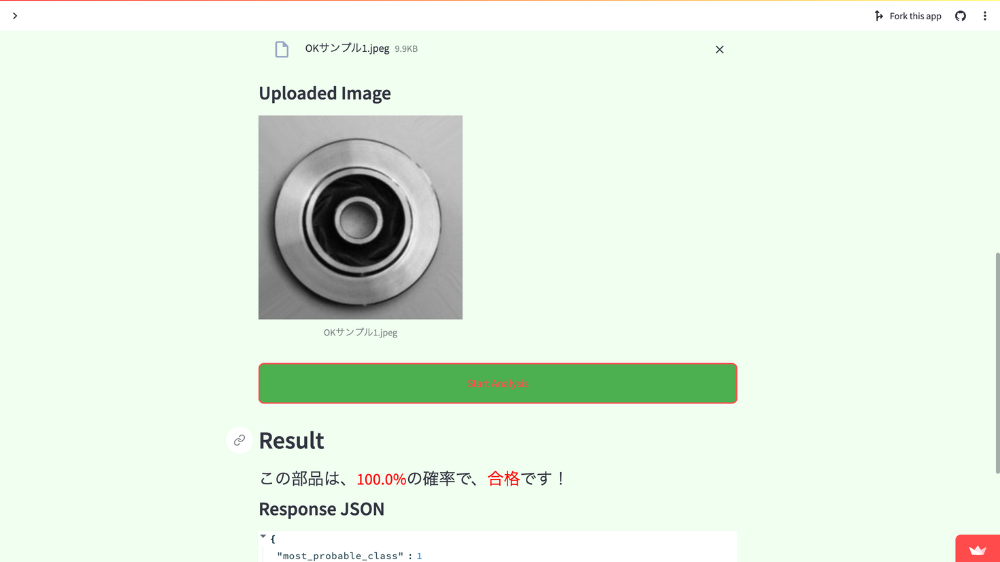 上記の画像のように、鋳造部品の画像をツールにかけたところ、「100%の確率で合格です!」と判定結果を出力すことができました。