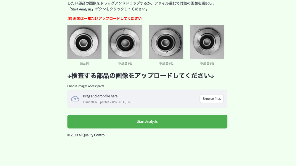 検査したい画像をアップロードし、Start Analysis を選択