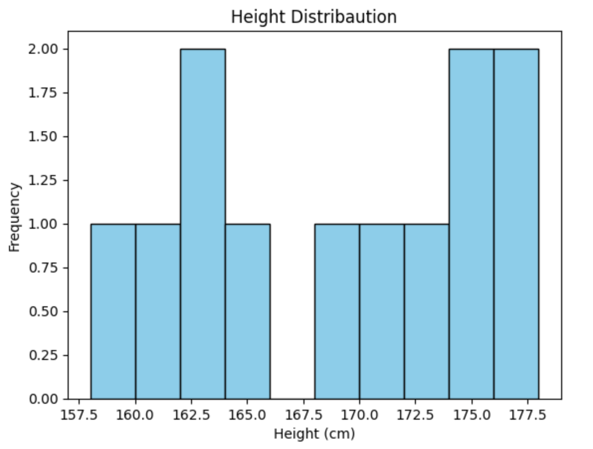 # matplotlib をインポート import matplotlib.pyplot as plt # ヒストグラムの作成 plt.hist(df_merged['Height'], bins=10, color='skyblue', edgecolor='black') plt.title('Height Distribaution') plt.xlabel('Height (cm)') plt.ylabel('Frequency') plt.show()