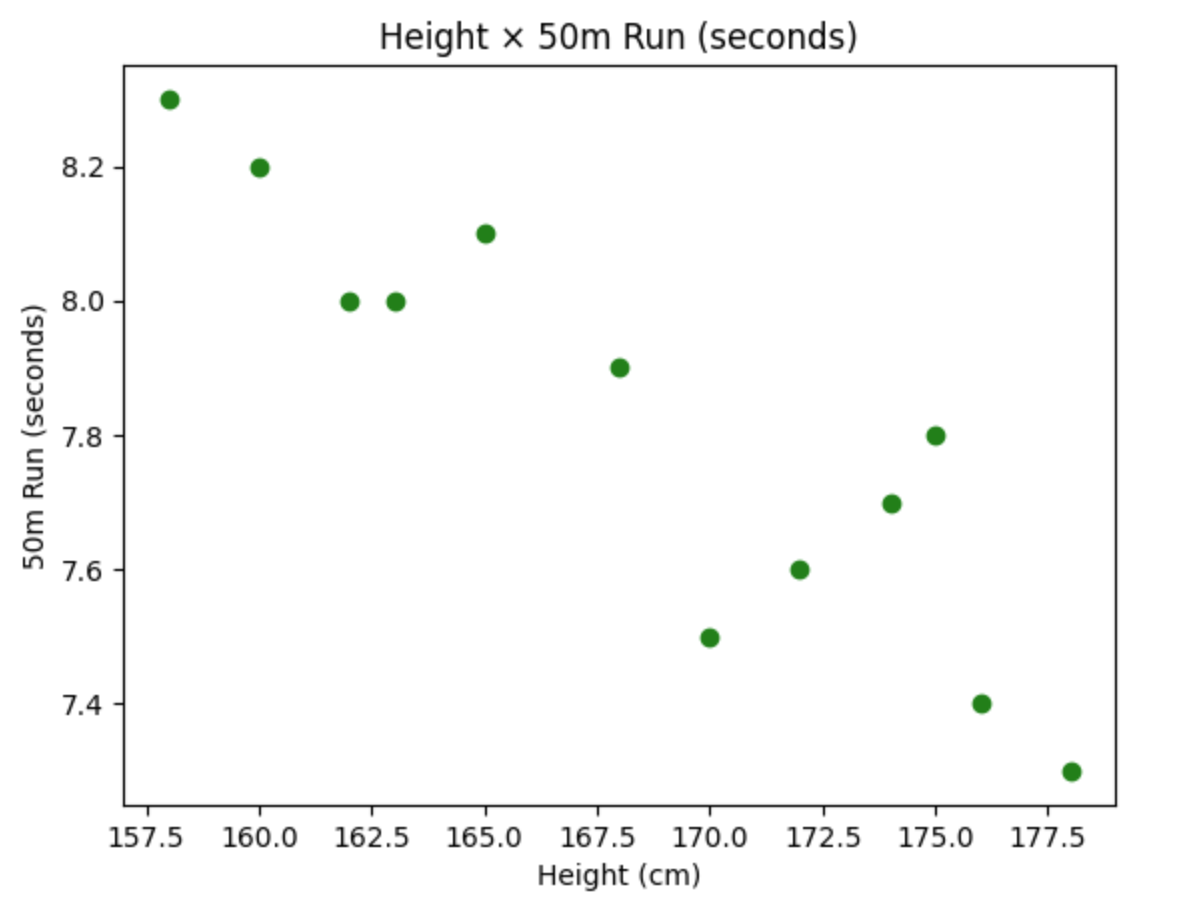 次に、身長と 50 m走の 2 つの変数間の関係を散布図で表現します。