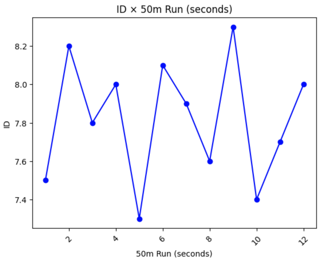 # 折れ線グラフの作成 plt.plot(df_merged['ID'], df_merged['50m Run (seconds)'], marker='o', linestyle='-', color='blue') plt.title('ID × 50m Run (seconds)') plt.xlabel('50m Run (seconds)') plt.ylabel('ID') plt.xticks(rotation=45) plt.show()