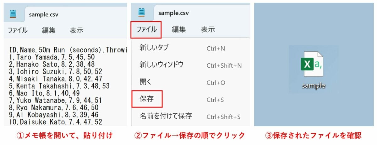 まずは CSV ファイルを作成しましょう。以下のデータは、 Sample High School ( S 高校)の体力測定結果を記録した架空のデータです。下記のデータを「メモ帳」にコピーして「 sample.csv 」という名前で保存してください。後に参考画像を載せます。