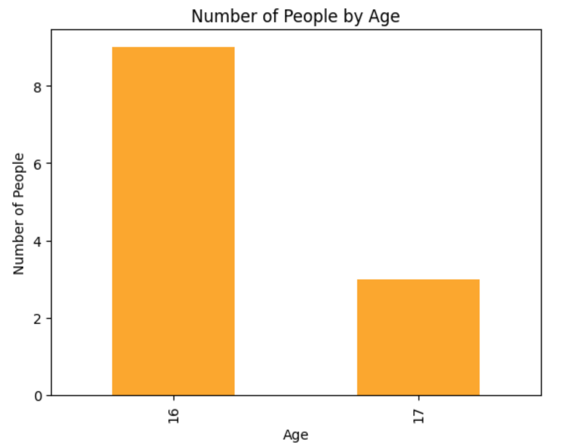 # 年齢をカウントして棒グラフを作成 df_merged['Age'].value_counts().plot(kind='bar', color='orange') plt.title('Number of People by Age') plt.xlabel('Age') plt.ylabel('Number of People') plt.show()