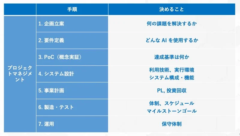 実際のビジネス現場では、企画立案からシステム設計までに「PoC(概念実証)」というステップを踏むことが多いです。この概念実証のステップで、データと試作モデルを用いて精度や効果の検証を行い、AI プロジェクトを推進していくのか、もしくは撤退するのかを判断します。